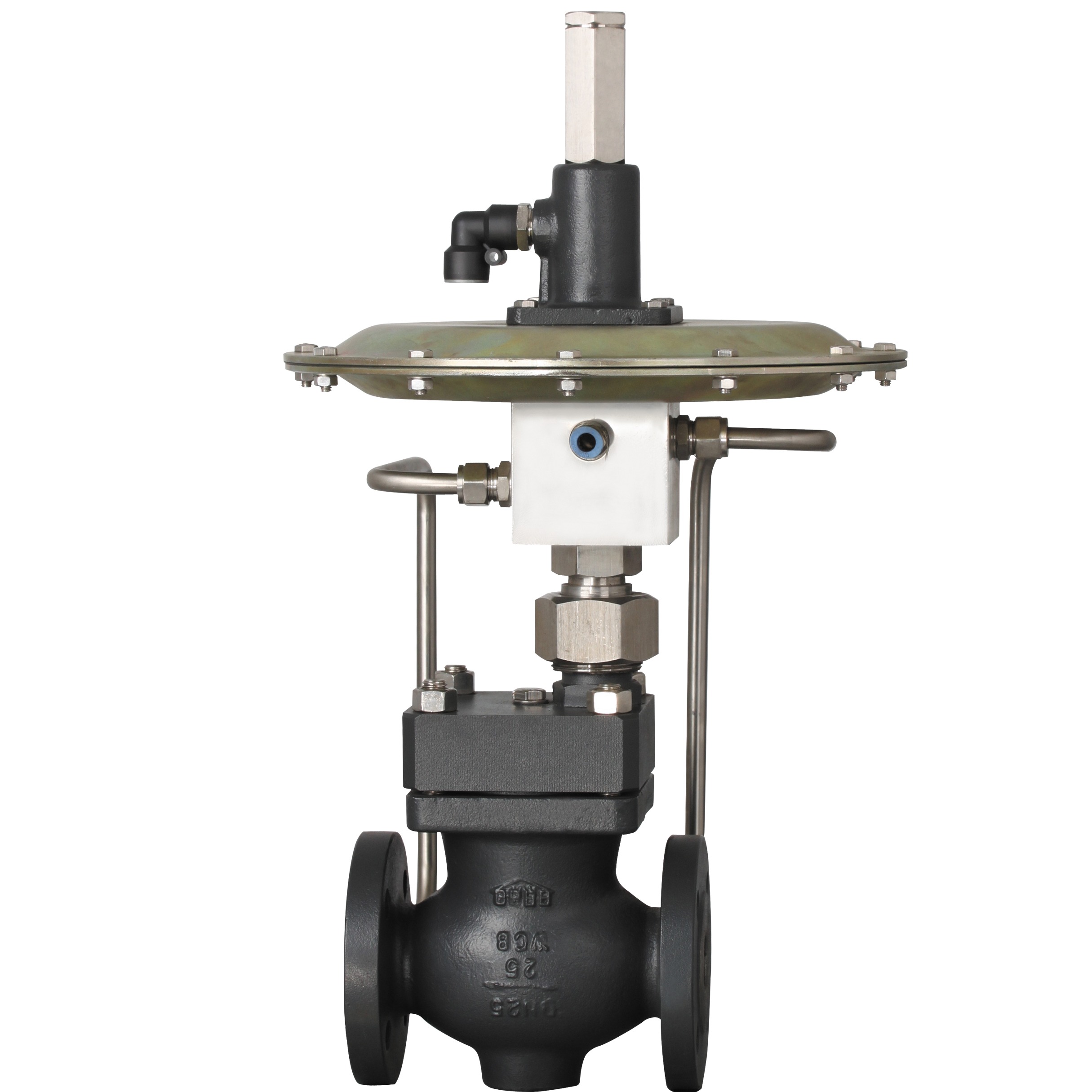 该阀门的压力设定在指挥器上的弹簧上实现,拧紧压缩弹簧阀后压力变大,反之则变小。与一般的直接取压自力式压力调节阀相比,它的操作更简单,并且精度更高。进口自力式氮封调节阀通常用于储罐氮封系统,主要功能是调节和稳定储罐的氮气压力,控制精度极其灵敏,阀后压力可以达到0.0001MPa (100pa,0.1kp)。